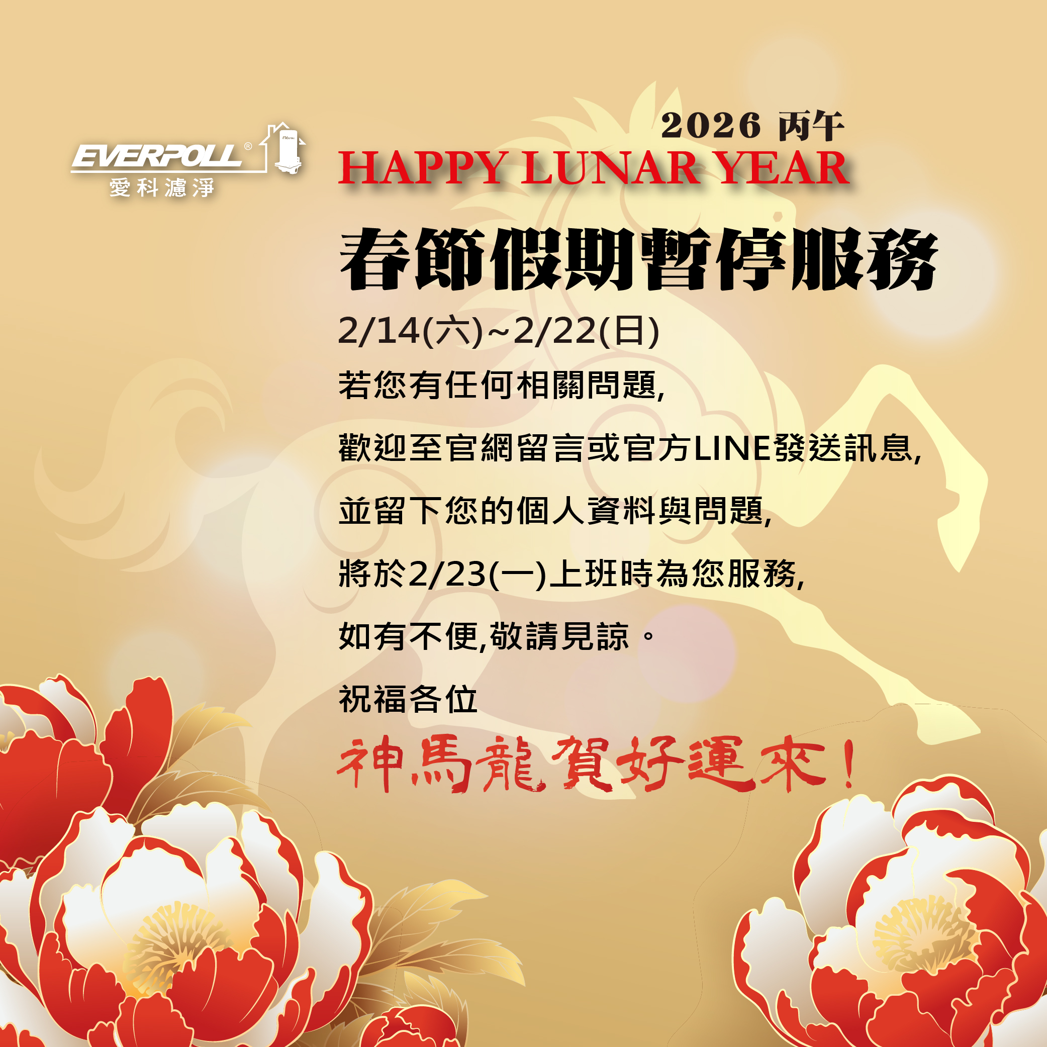 感謝您一直以來的支持與愛護,讓愛科濾淨成為您生活中的一部分。值此新春佳節來臨之際,我們向您致上最誠摯的祝福,祝 您馬年順心如意,好運一路相隨、事業順遂!